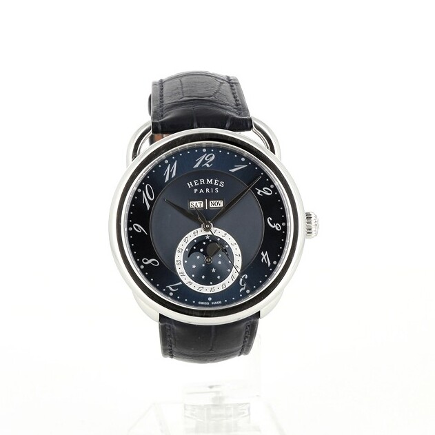 La Hermès Arceau Grande Lune W053222WW00 allie poésie et précision. Son boîtier en acier de 43 mm encadre un cadran bleu profond avec calendrier complet et phase de lune. Mouvement automatique visible par le fond saphir, porté par un bracelet en alligator bleu. Une montre sophistiquée, fidèle à l’élégance Hermès.