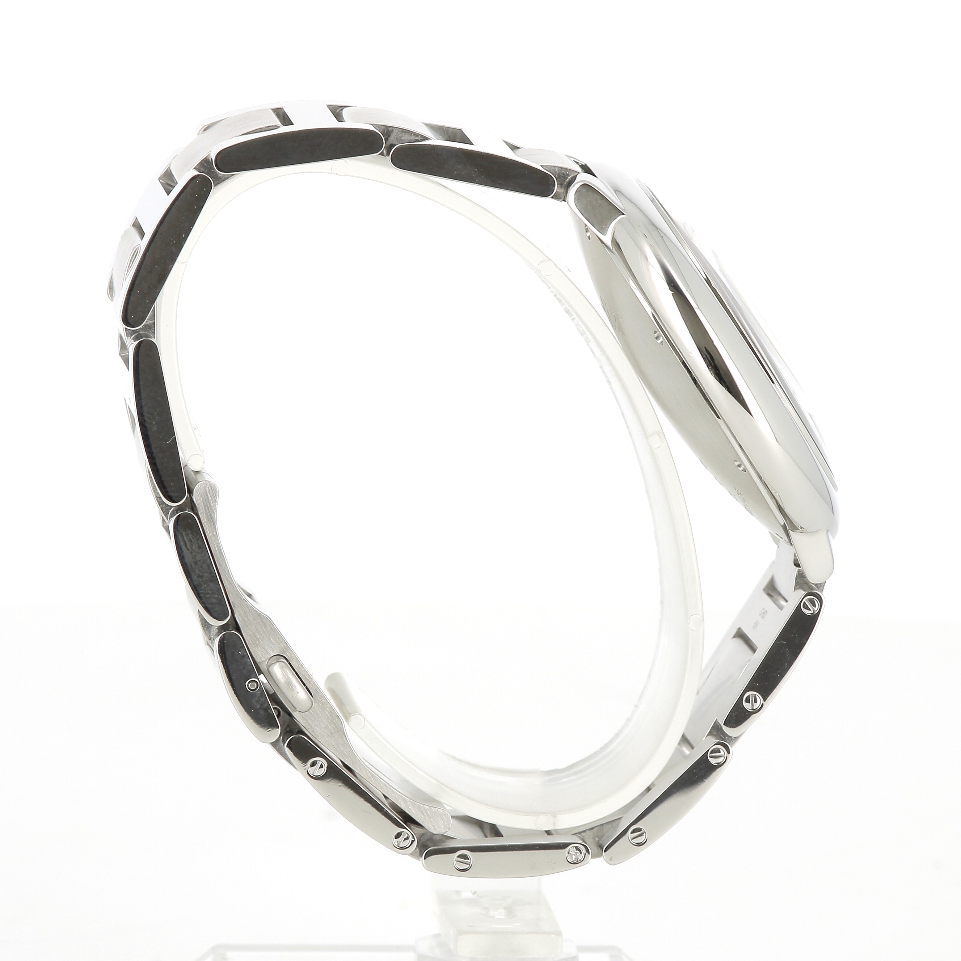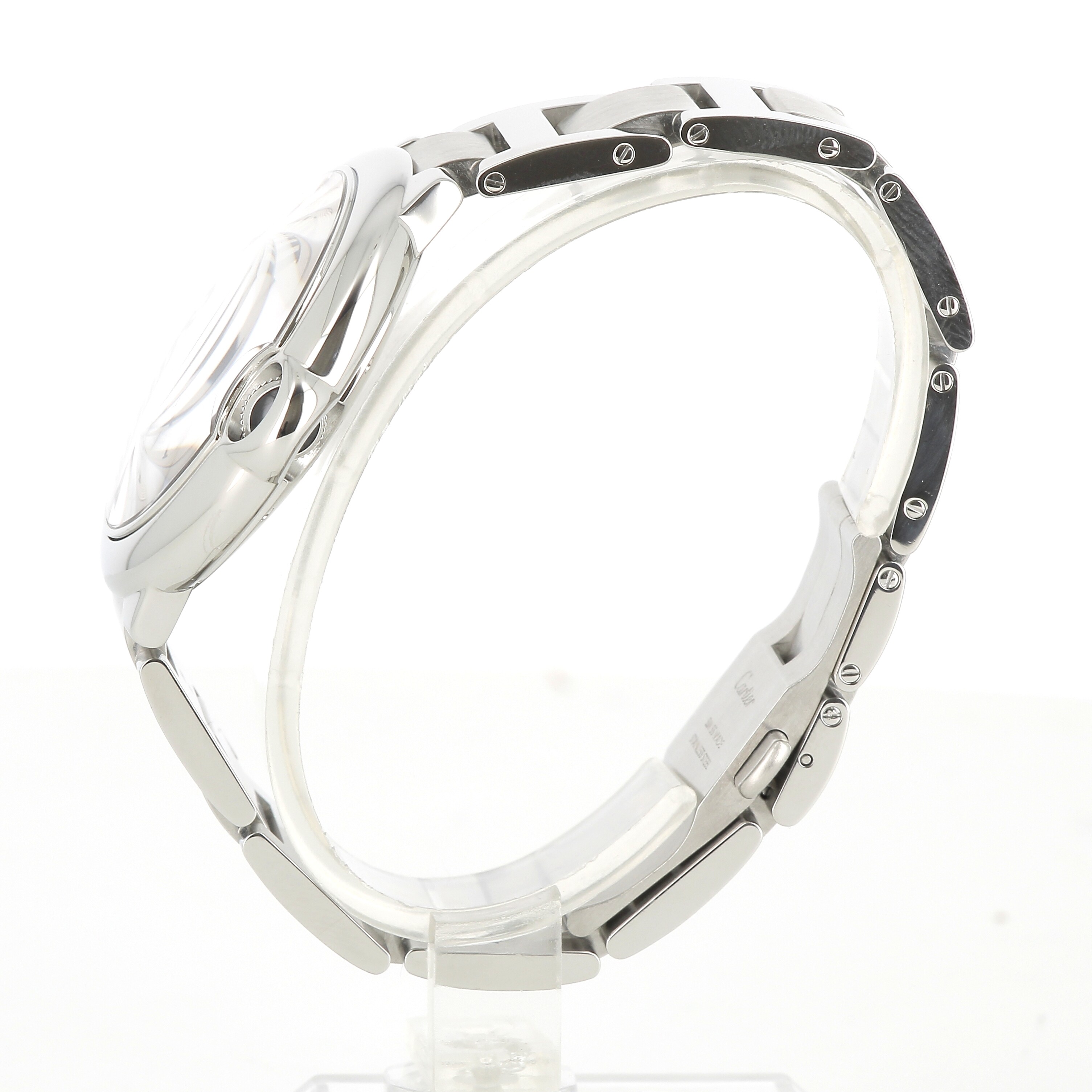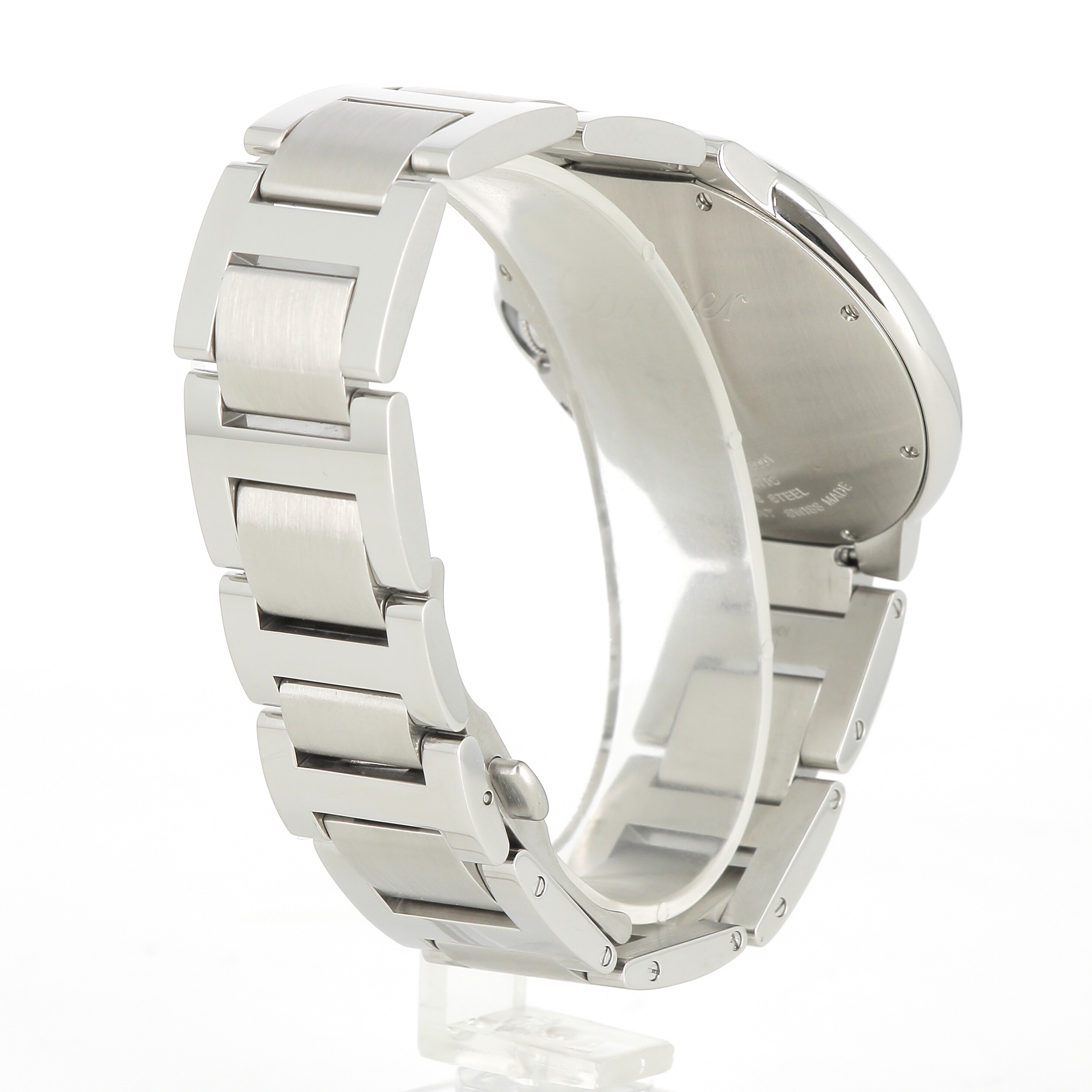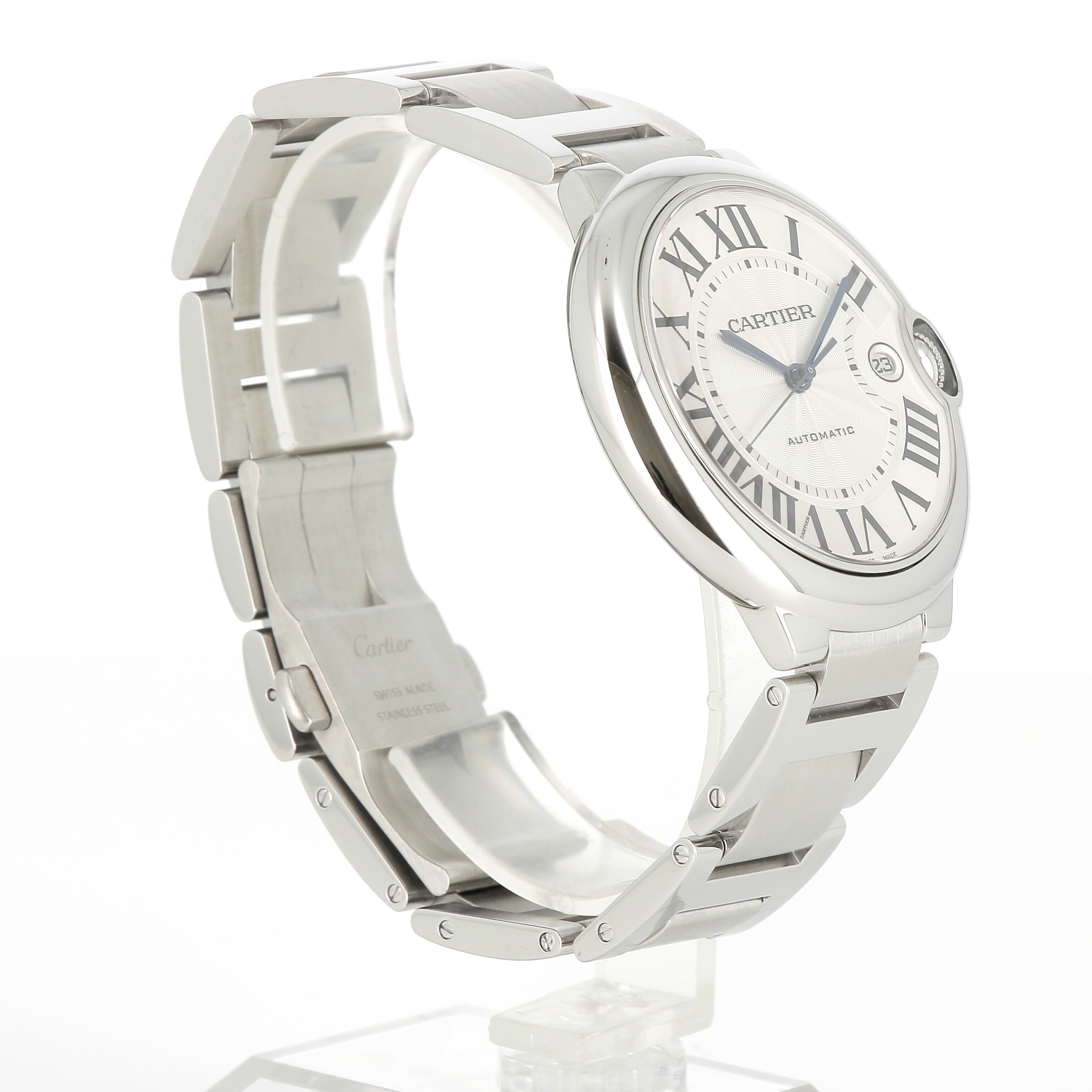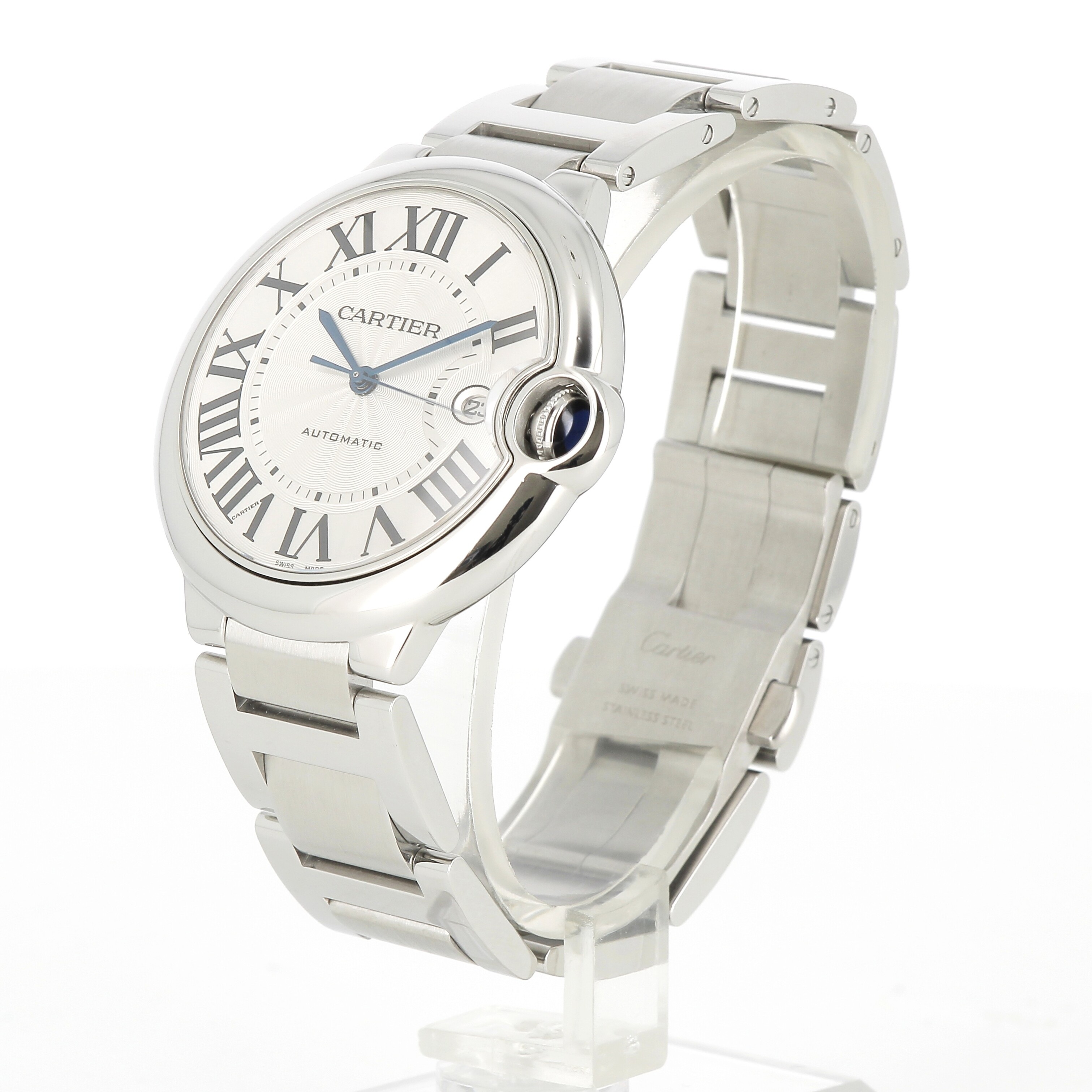Montre Ballon Bleu de Cartier, 42 mm. Mouvement mécanique à remontage automatique 1847 MC. Boîte en acier, couronne cannelée ornée d'un spinelle de synthèse en forme de cabochon. Cadran argenté guilloché. Aiguilles en forme de glaive en acier bleui. Glace saphir. Quantième à guichet à 3 heures. Bracelet interchangeable en acier. Épaisseur : 13 mm. Étanche jusqu'à 3 bar (~30 mètres).