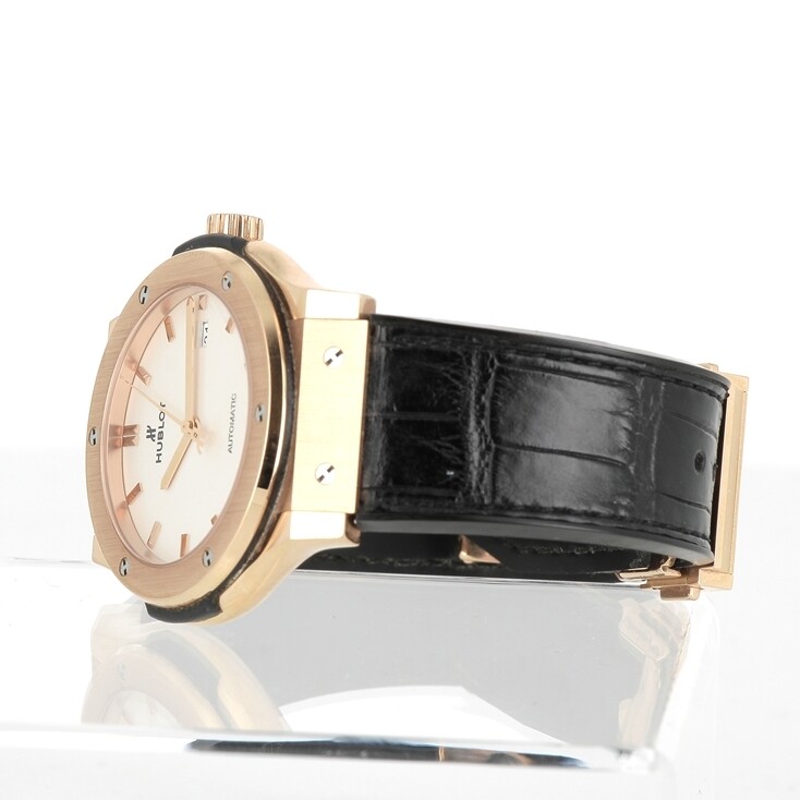 La Hublot Classic Fusion 42 mm King Gold est une montre de luxe au design épuré et moderne. Son boîtier de 42 mm est réalisé en King Gold 18 carats, un alliage exclusif plus chaud que l’or rose classique.