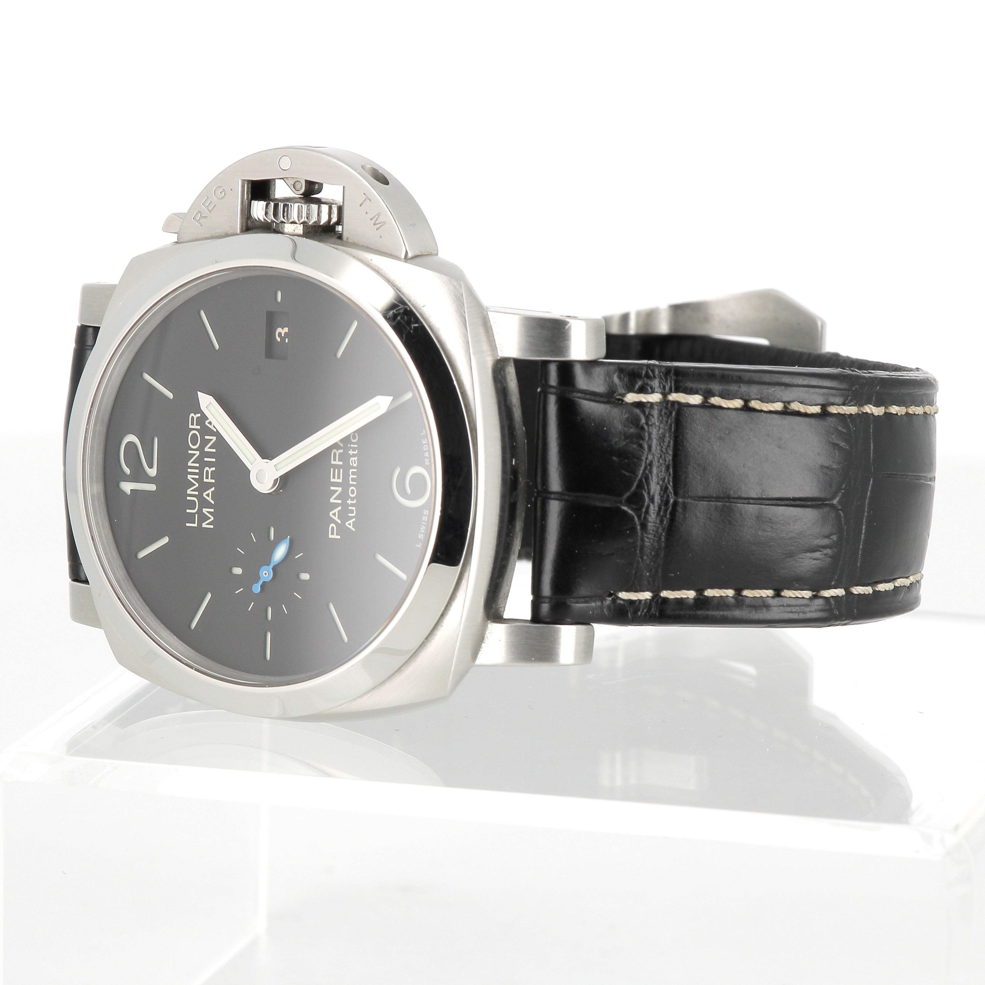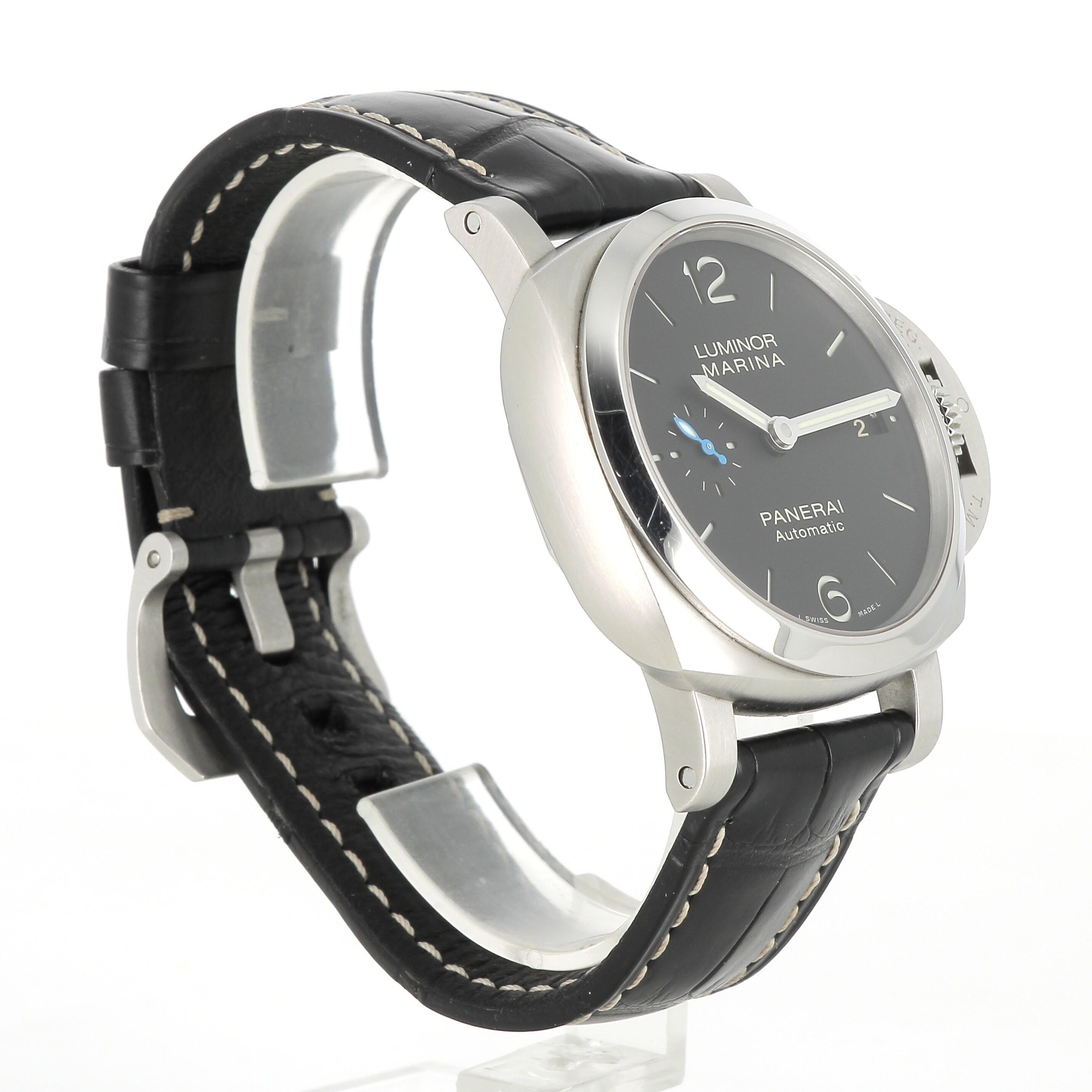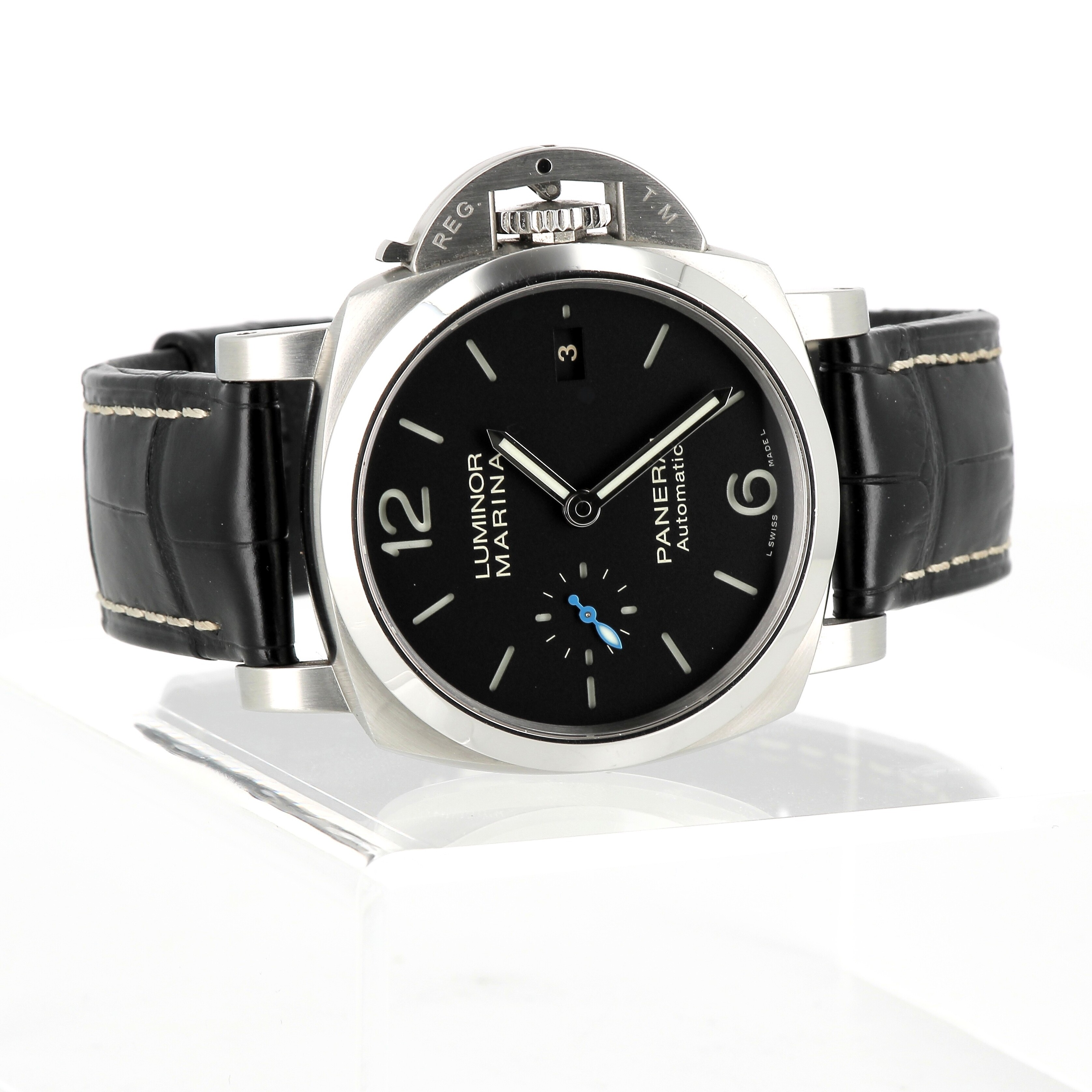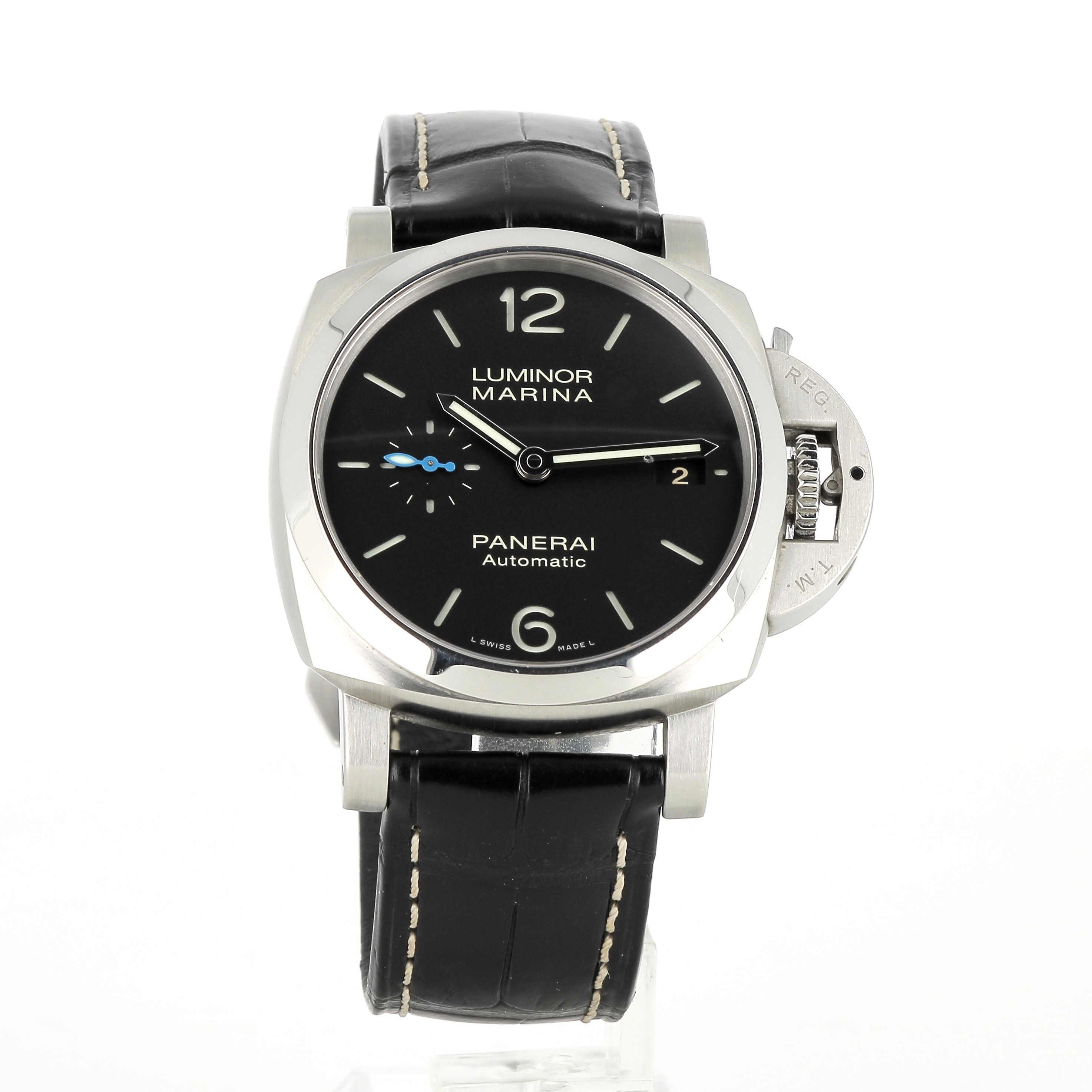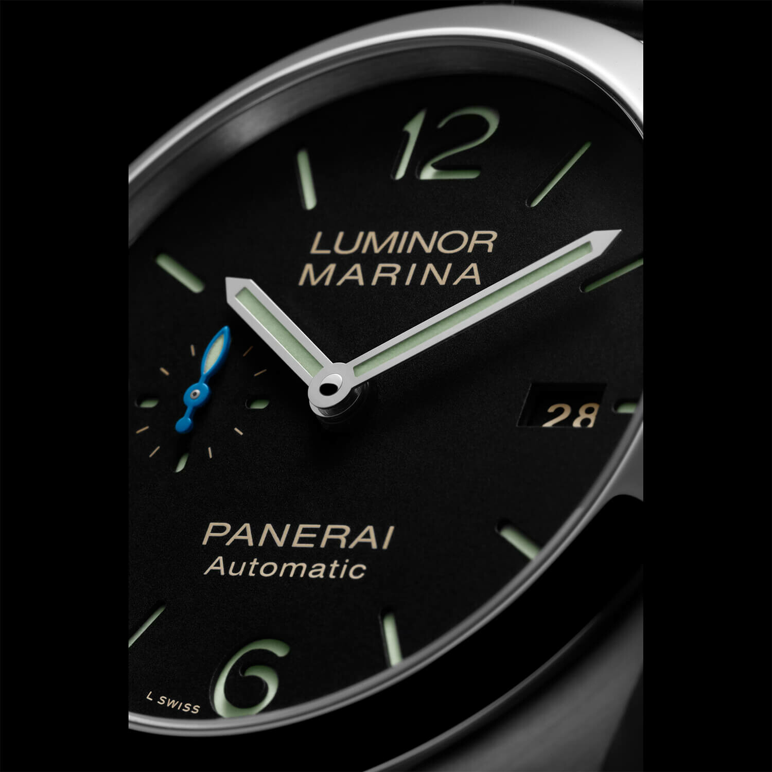 La Luminor Marina a été le premier grand succès de la marque Panerai. Dans les années 90, après des décennies de créations produites pour la Marine italienne et couvertes par le secret militaire, la Luminor avec compteur de la petite seconde à 9 heures a été l'un des modèles qui ont aidé la marque Panerai à se faire connaître dans le monde. Ses montres sont depuis devenues des icônes de l'horlogerie sportive de luxe contemporaine. Le cadran sandwich de couleur noire atteste du style Panerai, qui s’exprime à travers les grands chiffres aux points cardinaux, les index bâtons, un compteur de petite seconde avec aiguille bleue à 9 heures et un guichet dateur à 3 heures.