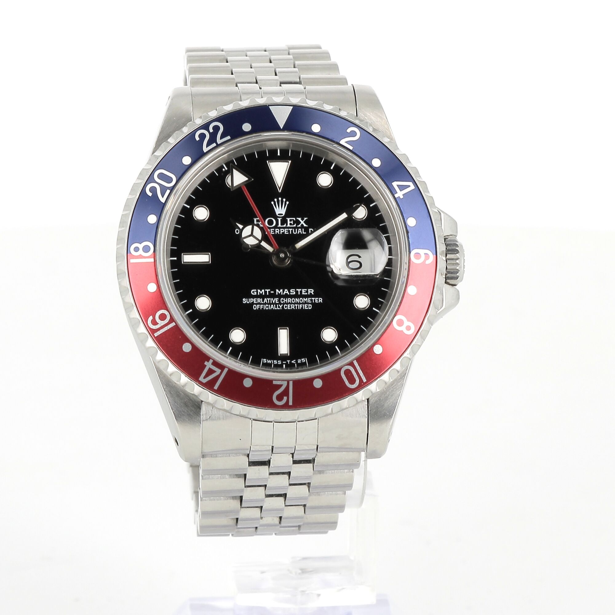 Montre iconique avec boîtier en acier de 40 mm, lunette bidirectionnelle Pepsi (bleu et rouge), verre saphir, cadran noir avec index tritium d'origine (marquage "Swiss - T < 25") et aiguille GMT rouge