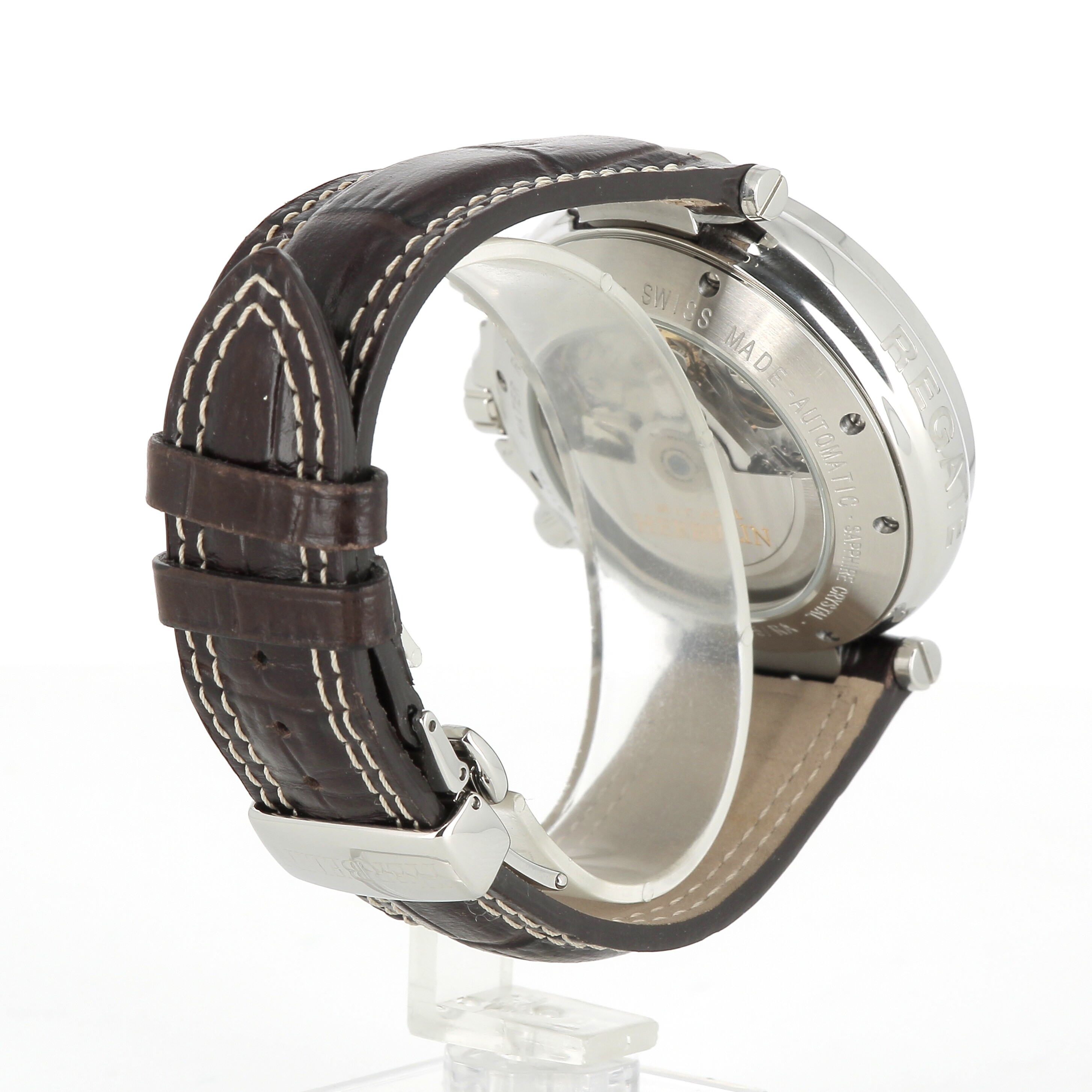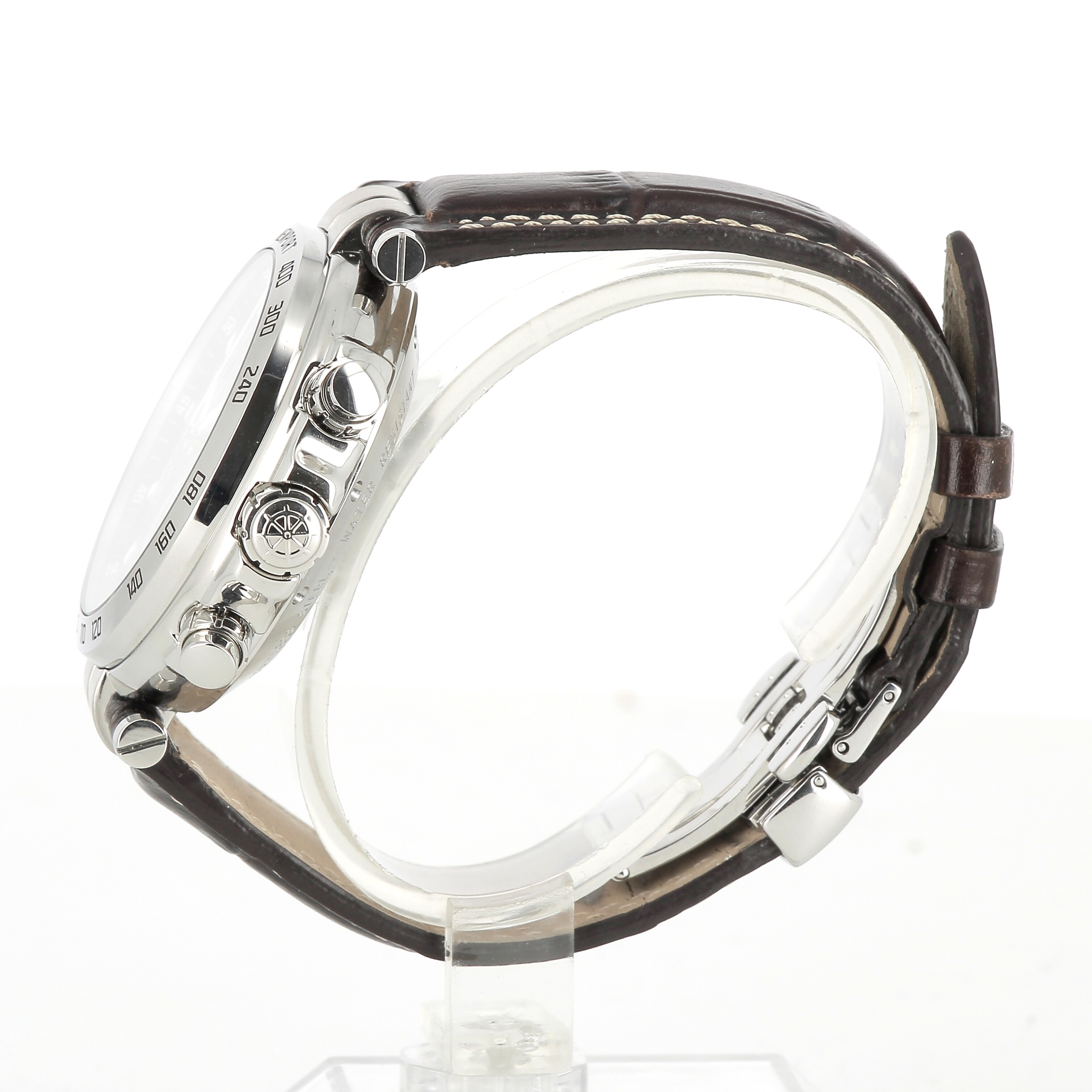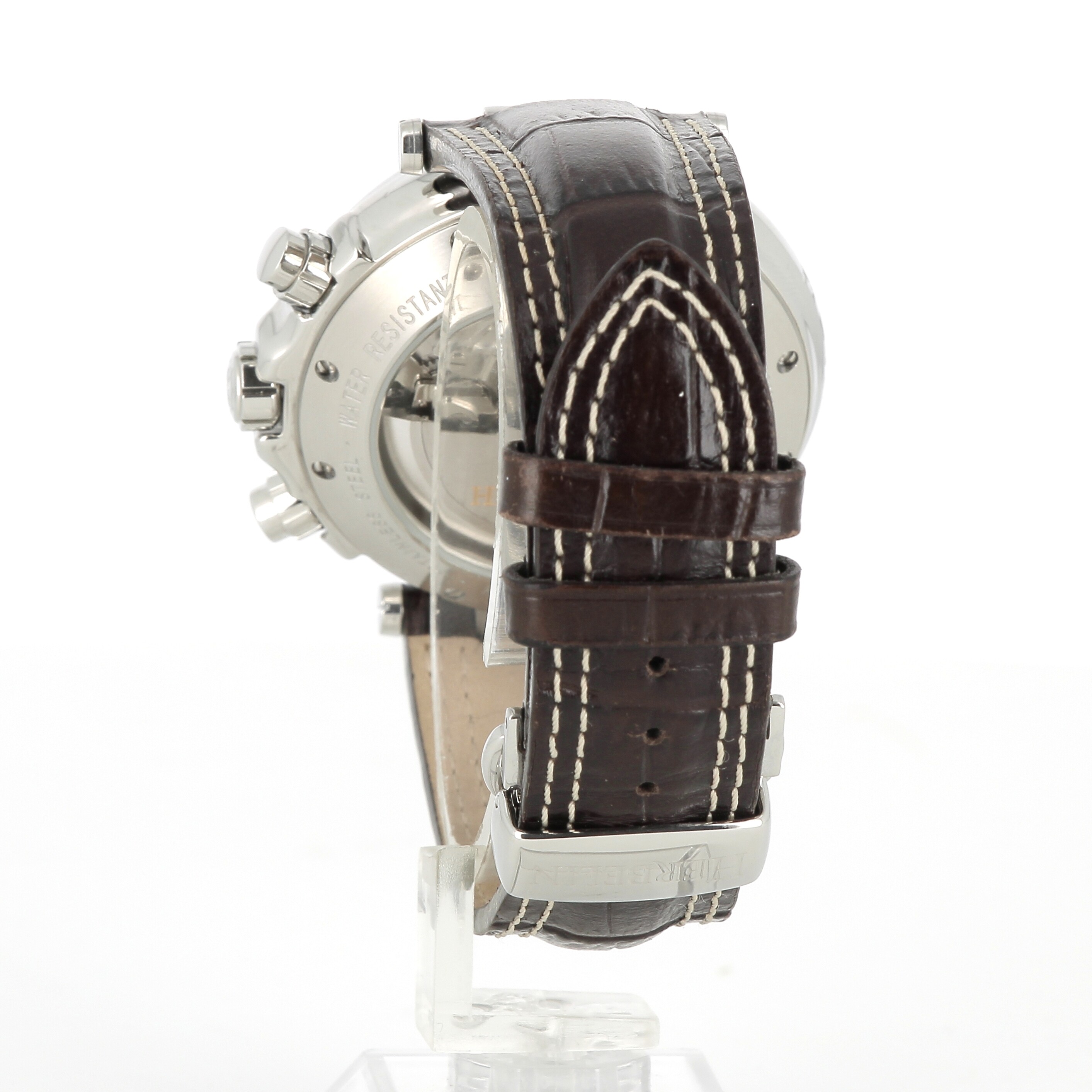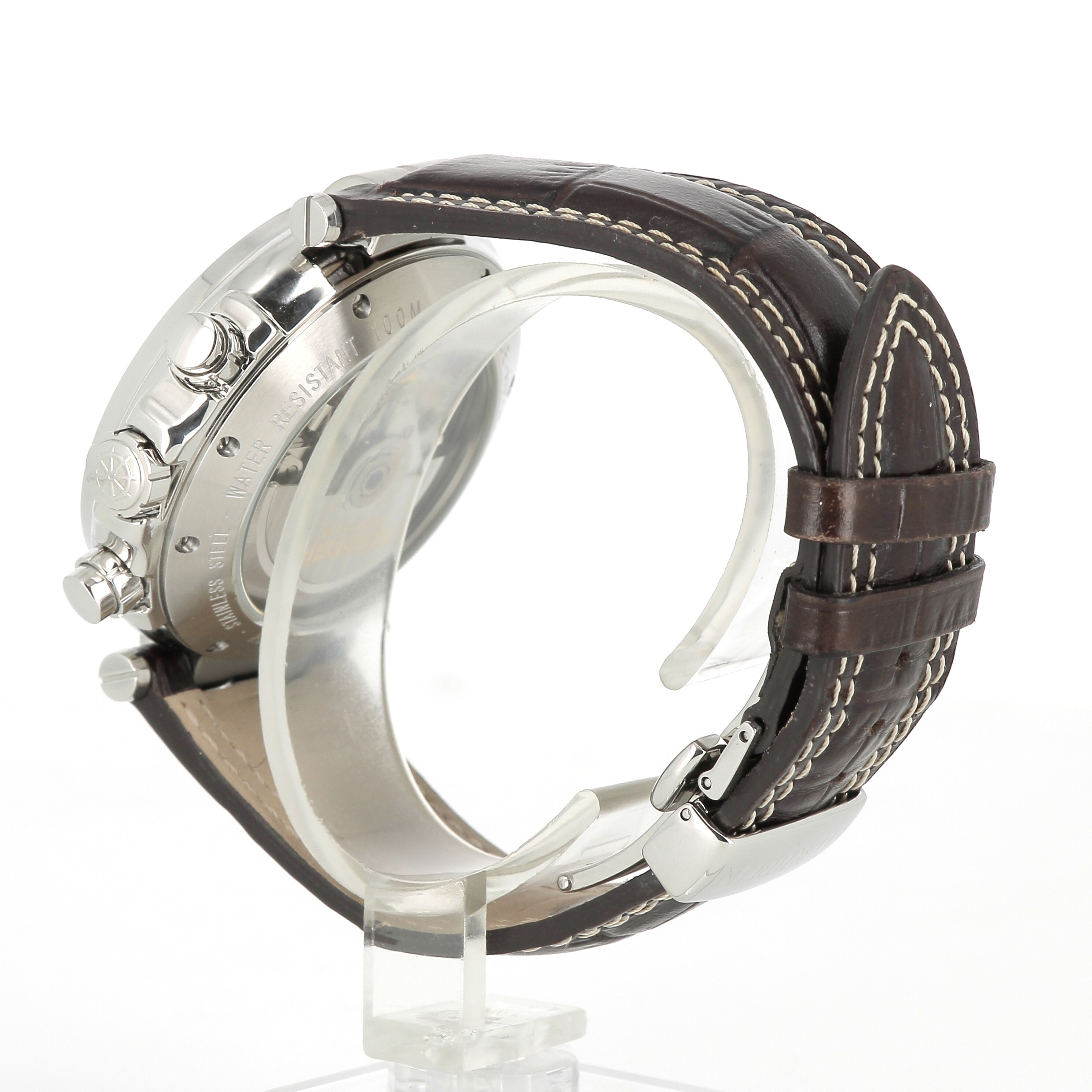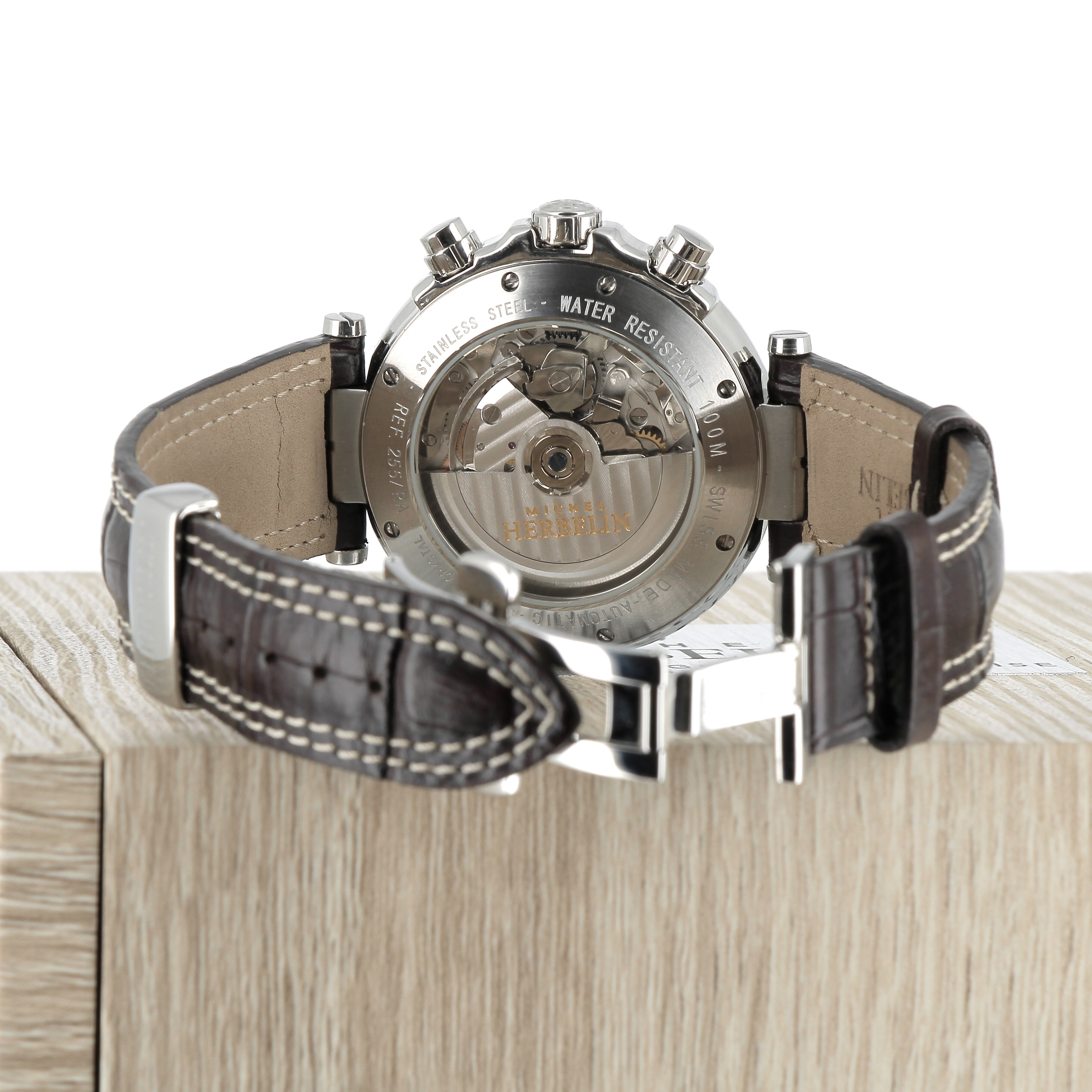 Dotée d’un mouvement automatique de type Valjoux, elle offre une précision remarquable ainsi qu’une belle réserve de marche, tout en laissant apparaître la mécanique grâce à son fond transparent. Son cadran brun, profond et chaleureux, apporte une touche de raffinement et de modernité, parfaitement équilibrée par ses compteurs de chronographe qui soulignent son esprit technique.