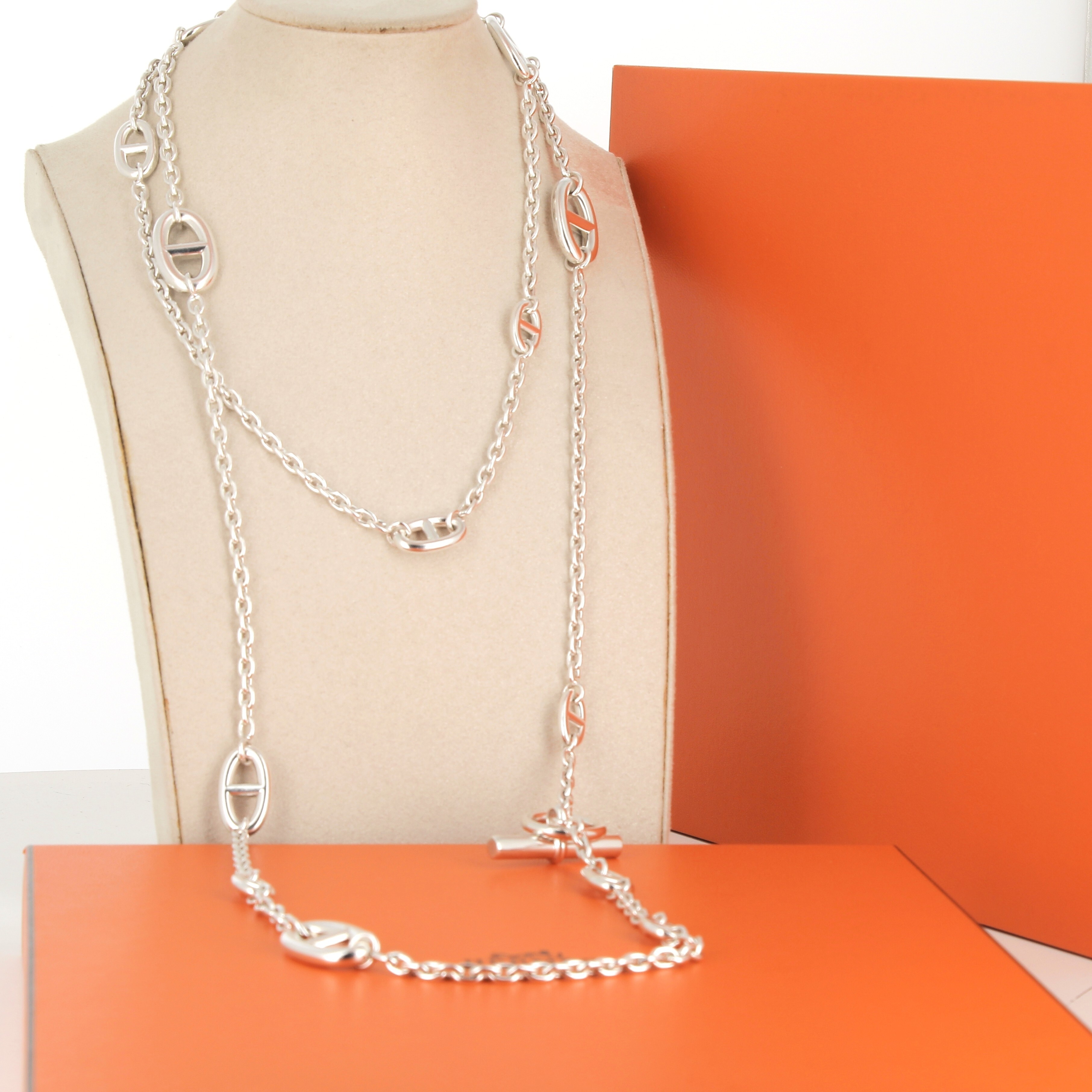 Le sautoir Hermès Farandole 120 cm est un long collier emblématique de la maison, réalisé en argent 925. Il se compose d’une alternance de maillons Chaîne d’Ancre, motif iconique créé dans les années 1930, ici déclinés en différentes tailles pour donner du rythme et de la légèreté au bijou. Sa longueur de 120 cm permet de le porter en un long tour, en double ou même en triple selon le style recherché. Fermé par un classique anneau-barrette Hermès, il offre un rendu à la fois moderne, intemporel et très reconnaissable.