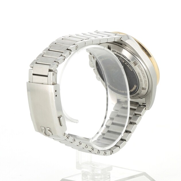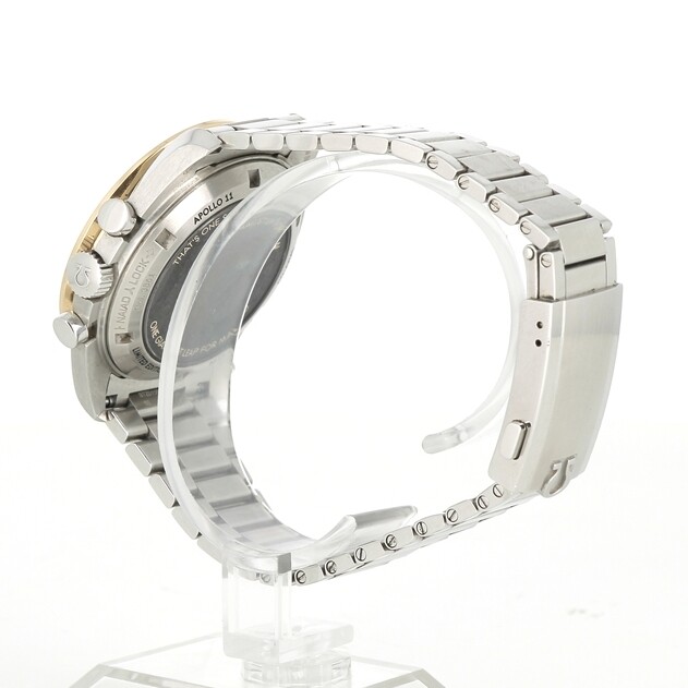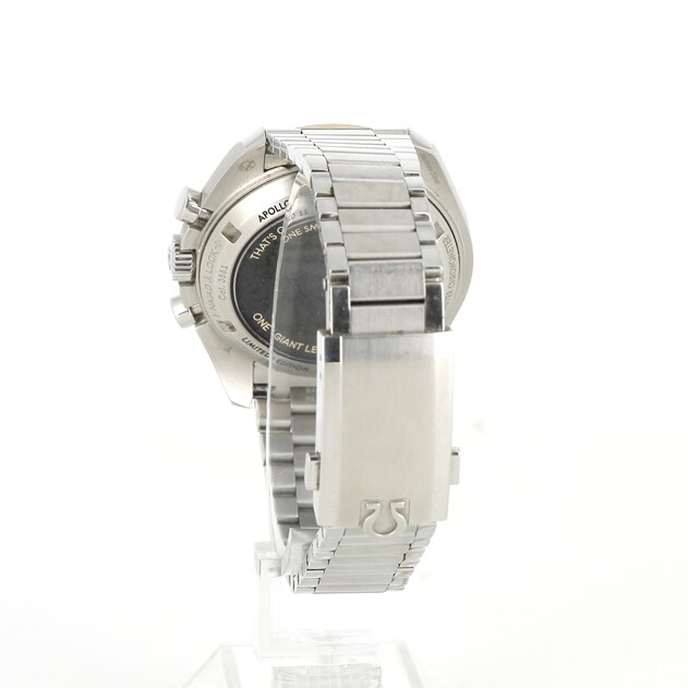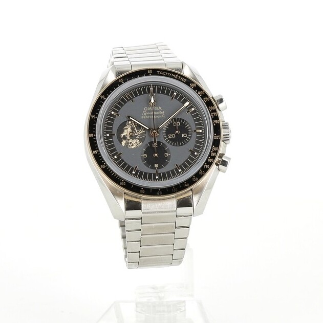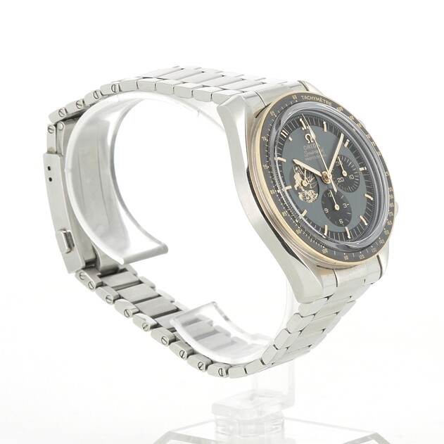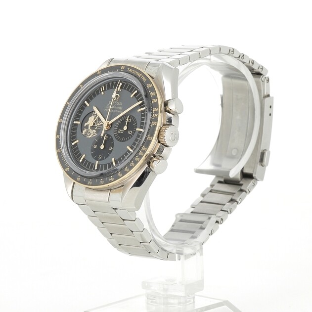 L’Omega Speedmaster Apollo 11 est une montre en édition limitée à 6 969 exemplaires, créée pour célébrer le 50ᵉ anniversaire de la mission Apollo 11. Elle possède un boîtier en acier de 42 mm avec une lunette en or Moonshine™ et insert en céramique noire. Son cadran bicolore arbore un sous-cadran gravé de Buzz Aldrin à 9 h, et un index spécial à 11 h en hommage à la mission. Elle est animée par le calibre manuel Omega 3861, certifié Master Chronometer, et offre une étanchéité de 50 mètres. Le fond de boîte présente une gravure du premier pas sur la Lune et la célèbre phrase de Neil Armstrong.